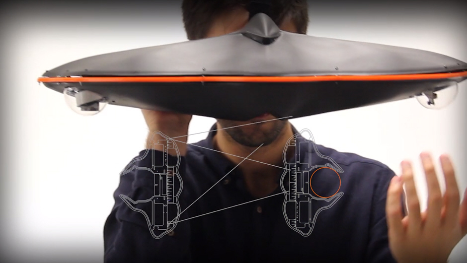 The wide headset, which looks like a hammerhead shark’s face if it was a sports car in the late 1980s, uses two Raspberry Pi Camera Modules, which pivot in little clear domes. They give the viewer at least 180 degrees of vision, and feed that vision through a Raspberry Pi computer module into a viewing screen, which splits vision down the middle so each eye gets its own field of vision. Here’s what that looks like: