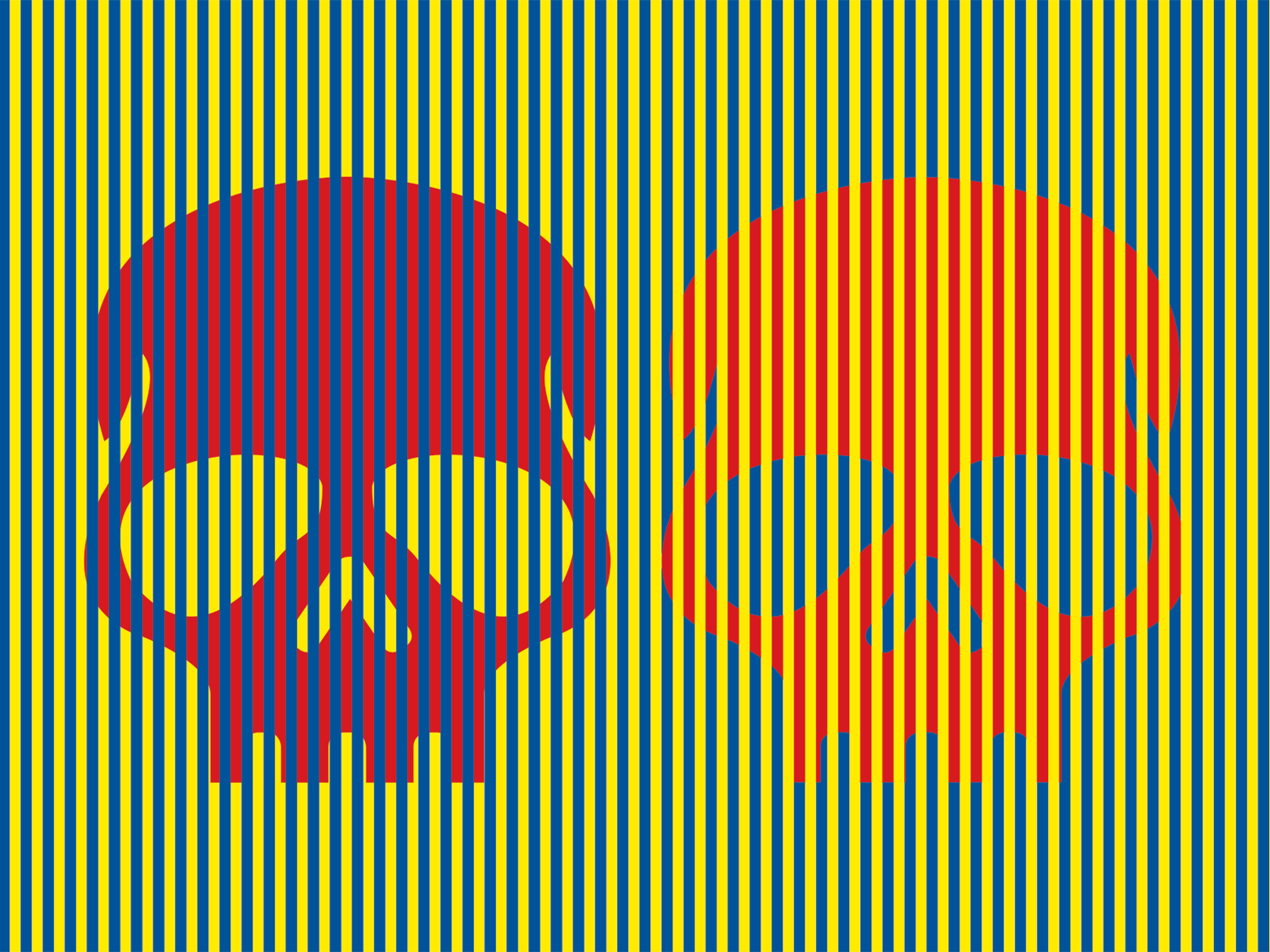Many neuroscientists think that neural signals in charge of relaying information about the pigments in our visual field get averaged—creating a color somewhere in the middle. Here, one skull is covered by blue stripes in the foreground and the other with yellow ones. When the original skulls take on the characteristics of the separate surroundings, they look like different colors entirely. Don’t be fooled: Follow both skulls by going straight.
