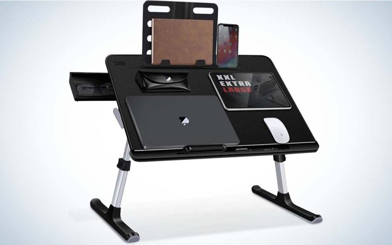 Whether you’re lounging at home or on the go, the SAIJI Lap Desk makes working much more comfortable with its ergonomic features and stylish design. The desk also features a foldable bookstand, a storage drawer ideal for your mobile device, and a non-slip textured design to keep your laptop in place. It’s also height-adjustable and features two auto-lock buttons on each side to seamlessly switch between five different height levels to find your ideal viewing angle. You can also use it as a cost-effective way to turn your current sit-down desk into a standing one. Simply stow it under your couch or in a closet when you’re done using it for the day. The latch on the left side of the desk that locks the tray tilt also blocks the drawer from opening, reviews note. If this desk doesn’t tickle your fancy, check out our other laptop-friendly desk recommendations.