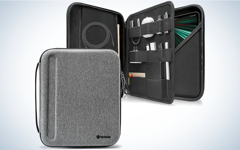 If your trusty Apple Pencil is your primary means of input, you may want to consider buying an iPad Pro case that has the perfect place for your key accessory so you don’t risk misplacing it when you need it. This Zugu Case is the best iPad Pro case with a holder because of its snug Apple Pencil caddy that will hug the writing accessory tight and keep it clean of dust and debris that can easily sneak into bigger pockets. And, with a stand featuring 10 magnetically secure viewing angles, you can use that pencil in a way that feels comfortable to you. You also get the sleek look of leather in a more affordable blend of material that also includes microfiber and polycarbonate. At under half a pound, the Zugu case is light as a feather, easy to clean, and should protect your iPad Pro even if it manages to drop up to 5 feet to the ground. (Still, we wouldn’t suggest that you try that at home.)