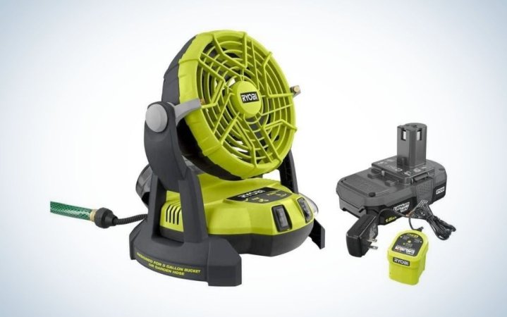 - Best battery-operated: RYOBI 18-Volt ONE+ Bucket Top Misting Fan Kit
