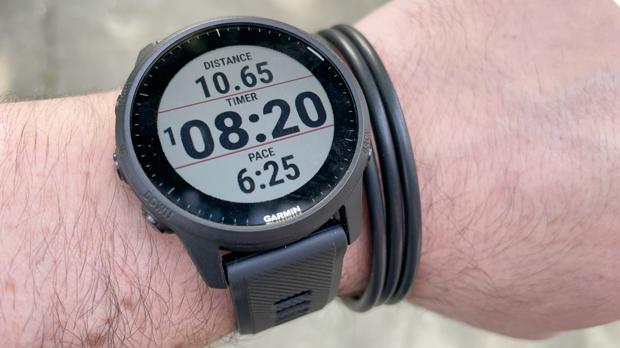 This Forerunner is a surprisingly classy athletic watch. It’s not as chunky as the company’s Instinct Solar [check out our hands-on review]. And, while nowhere near as sleek as the Venu 2 [see our thoughts on that model], the understated design looked good when I met some coworkers for dinner. At 44.4 mm in diameter, 13.9 mm thick, and only 49 grams, it’s comfortable, too. Like many of Garmin’s sports watches, the Forerunner dons a familiar array of five control buttons, which I had no problem finding by touch while working out.