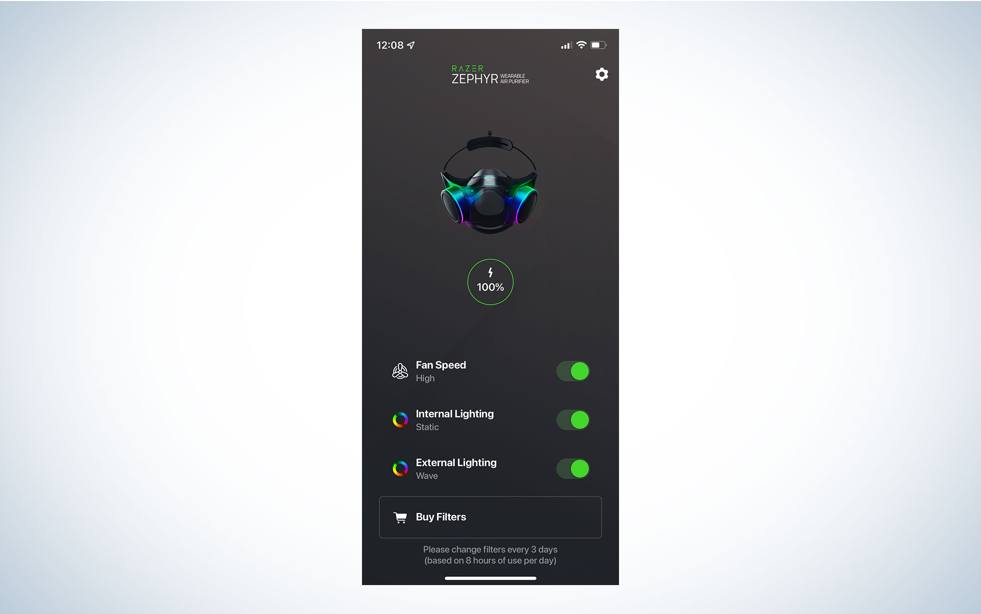 The Razer Zephyr has its own discrete “Zephyr” app for iOS and Android, which controls the custom RGB lighting and fan speed. The app is a fairly simple, no-frills affair: After pairing via Bluetooth, there are a few toggles that let you switch the fans, the inner lighting around your mouth, and the outer lighting around the fans. The lighting options are limited compared to a Razer keyboard like the Razer Huntsman V2 Analog, but you have preset patterns and the ability to choose your own shade from the full RGB spectrum.