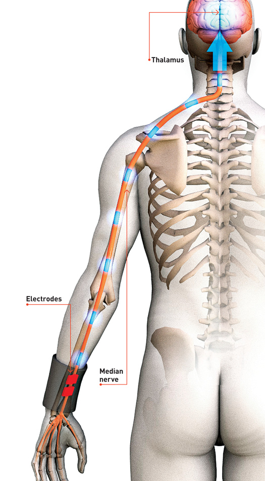 Electrodes send electrical signals along the median nerve in each wrist, up the spinal cord and to the thalamus, the main relay station in the brain. The electrical activity excites the brain and increases oxygen- and glucose-rich blood flow to the cerebral cortex, the area of the brain that controls cognitive function, personality and emotion. Scientists think this helps stimulate new axon growth and rebuilds connections between damaged areas of the cerebral cortex.