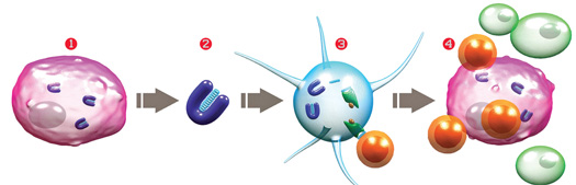 4. T cells seek out and destroy new cancerous cells with the matching protein signature, while leaving healthy cells [green] alone.