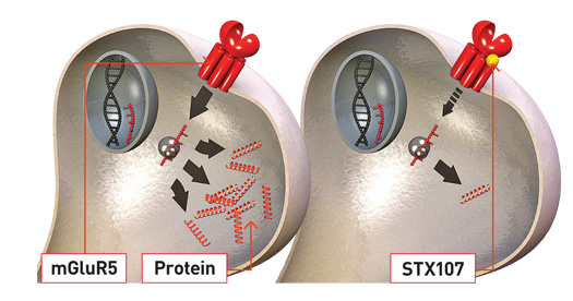 Fragile X neurons lack the ability to mute messages from the mGluR5 receptor, leading to an overproduction of protein. STX107 binds to the receptor, dampens its productivity, and slows protein production to a normal rate.