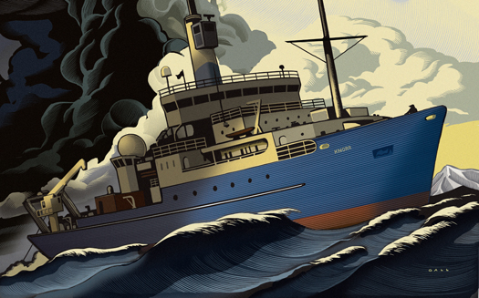 At 10 P.M., Sheasley instructed the helmsman to idle the engines and turn on the exterior lights, which gave the aft deck a theatrical brightness. Underneath the A-frame crane that straddled the stern, there gaped an opening in the bulwarks. Until an hour ago, a safety chain had stretched across it. Now the chain had been undone, and there was nothing between the deck and the sea; walk through the portal of the crane, step into the yawing darkness, and you’d fall into water two miles deep. Every so often, a wave came crashing up over the stern, glazing the deck with a slippery veneer that went rippling out the scuppers. This was the stage, the turbulent precipice, on which the night’s action would play out.