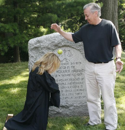 When a graduate student earns his doctorate at the Institute of Cosmology, he undergoes a strange ceremony befitting the history of the Institute and the Foundation that paid for it. The graduate kneels down and his advisor drops an apple on his head, in hopes that it might inspire him in the manner of Isaac Newton. They do this in front of Babson’s monument.