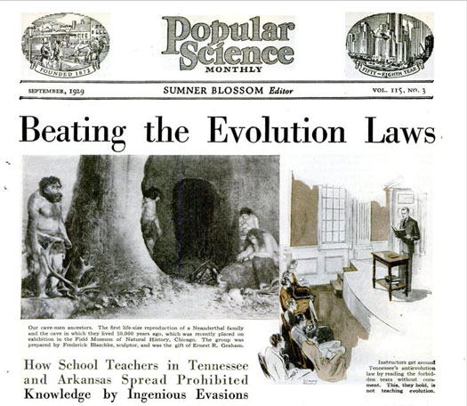 In May 1925, high school biology teacher John T. Scopes was accused of breaking the Tennessee’s Butler Act by teaching evolution from a textbook. This of course led to the highly-publicized State of Tennesse v. Scopes case, also known as The Scopes Monkey Trial. Four years after Scopes’ guilty verdict was overturned, we revisited the event by doing a write-up on how other instructors were circumventing restrictions against teaching evolution. Writer Orland Kay Armstrong toured the “antievolution belt” to find that many professionals (even active church members) were bent on educating their students on Darwin’s theories without getting caught. Since the anti-evolution law in Arkansas only specifically banned the theory that mankind descended from primitive creatures, one science teacher from Arkansas would teach the evolution of plants and animals, in hope that his students would conclude that mankind had also evolved from single-celled organisms. Another teacher would talk about Darwin’s theories without commenting on them, while others would refer their students to library books about evolution without presenting their content in class. Teachers weren’t the only ones who acted sneakily, though. Since the law in Arkansas didn’t prevent people from ordering books on evolution from another state, some students would take the initiative to buy these books and educate themselves.