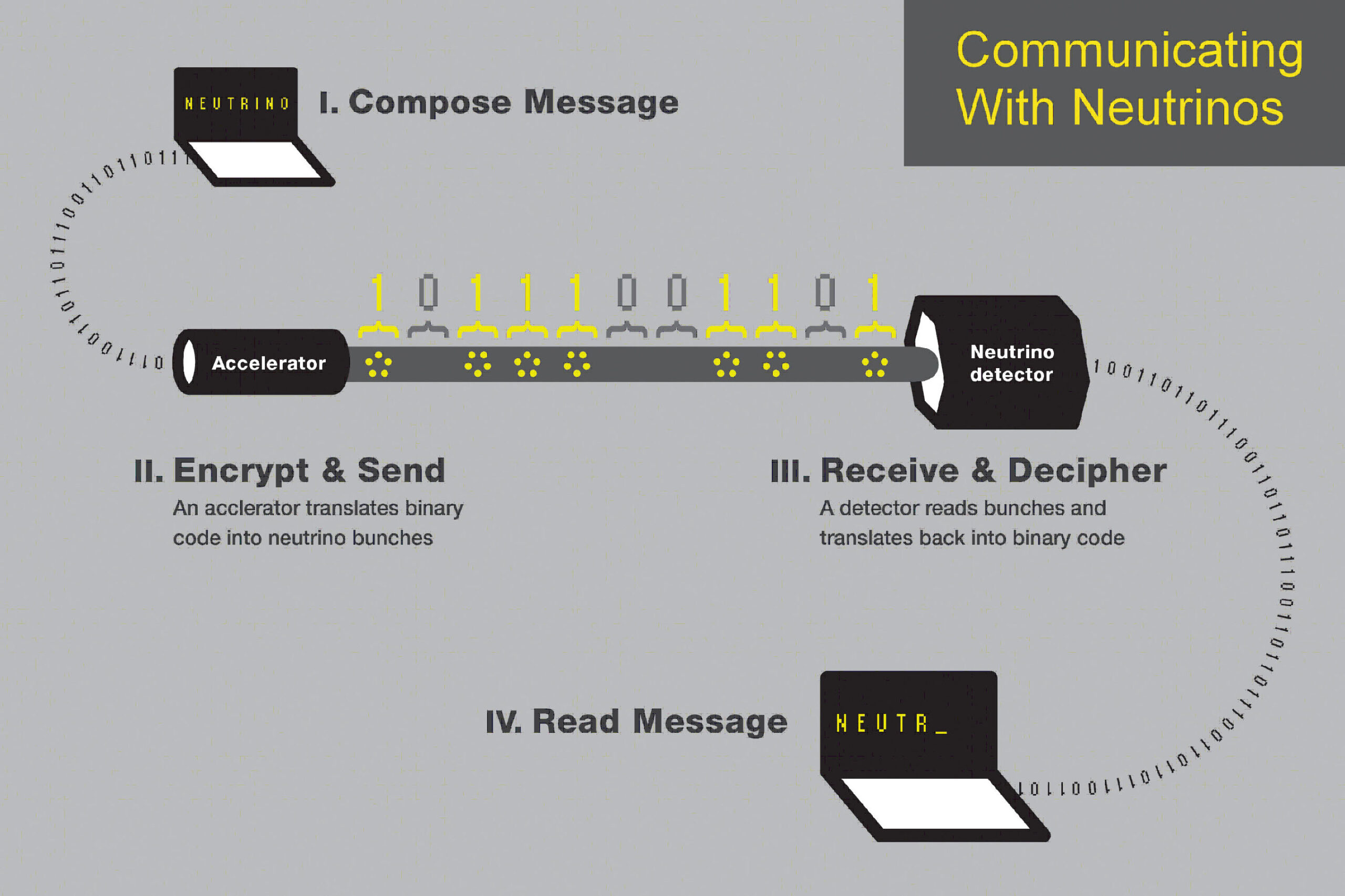 Neutrinos are incredibly hard to detect, so finding them requires enormous networks of equipment. Even with a multi-ton detector like MINERvA, only about one in 10 billion neutrinos is spotted. After MINERvA detected them, the binary signal was translated back into English, and the word “neutrino” was received loud and clear.