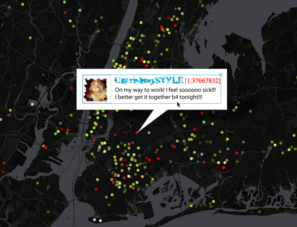 This sounds something like Google Flu Trends (which monitors for outbreaks by noting when and how often people in a geographic area search for flu-related terms) but it goes beyond that. By analyzing 4.4 million tweets tagged with geolocation data over one month using a special algorithm, the team was able to heat map flu incidences around the city. The algorithm knows how to tell the difference between non-literal terms (“so sick of work today you guys;)”) and tweets that actually express a flu symptom. From the GPS tagging, they could also see where these sick-feeling people were circulating in the city, and which other tweeters were circulating near them.