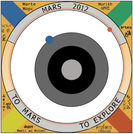 On the target’s face, the name MARS appears in 16 different languages. In the center, the sundial itself represents the sun, and concentric circles surrounding it represent the orbits of Earth and Mars, which are themselves represented by a pale blue dot and a red dot. Each home-plate color slice has a phrase describing what the mission means for human exploration. It reads: