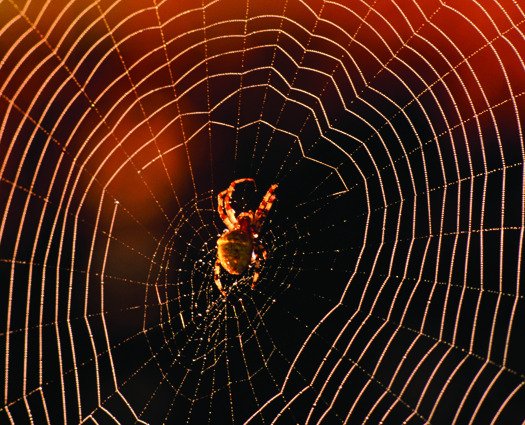 Orb-weavers, arachnids that capture their prey using sticky webs, make up more than one fourth of all known spiders. These species spin their creations with spiral crossbeams dotted with drops of viscous goo. (The webs’ radial and framing threads are left clean.) When an insect brushes against these drops—each thread can carry several dozen per millimeter—it gets stuck, and the spider rushes over to inject it with venom or cocoon it in silk. The question, of course, is how does the predator escape its own glue traps?