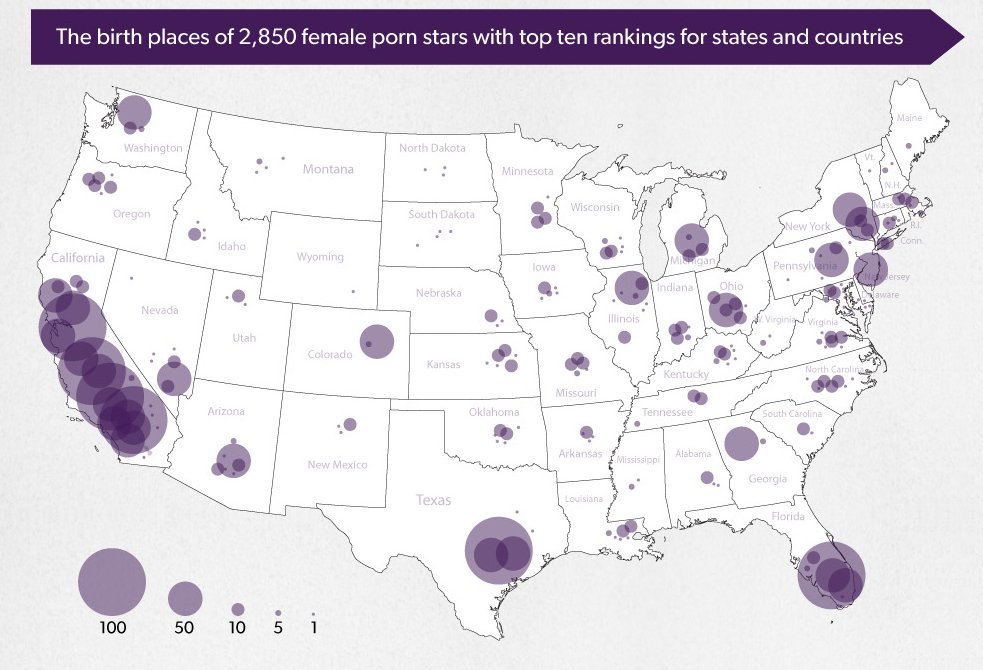 - A third of porn actresses say they were born in California. (3,000 of the actors Millward included in his analysis were men, but he talks a lot more about the women in his blog post.)