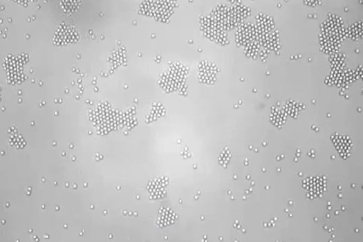 The researchers developed self-propelled particles that would turn on in response to blue light. When the light is on, the randomly swimming particles collide and cluster. A chemical reaction set off by the light causes the particles to crystalize. When the light turns off, the particles stop and split apart.