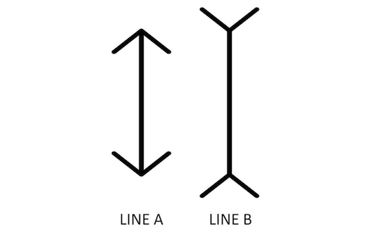 If you’re like almost everyone whom Müller-Lyer tested, Line B will appear longer than Line A. In fact, the two lines are identical in length, as this doctored version of the illusion shows: