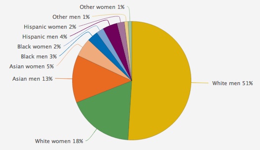 The majority of working scientists and engineers (51 percent) are white men, with the next-largest groups being white women (18 percent) and Asian men (13 percent). One promising detail: these figures probably won’t stay that way forever. Women and underrepresented minorities are earning greater and greater shares of math and science degrees every year, it’s just that the job market, which includes scientists who might have trained any time in the last 30 years, doesn’t yet reflect that diversity.
