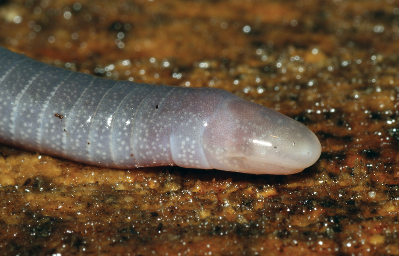 Update: And the winner is…Maggie Ryan Sandford, who correctly guessed that this is a caecilian! (And provided us with an unsettling picture of, as she says, “their totally grody egg situation.”) Caecilians are the little-known third branch of the amphibian tree, along with frogs and salamanders. (Toads are, taxonomically, just a type of frog.) They evolved differently from the other amphibians: unlike frogs and salamanders, they live almost exclusively underground.