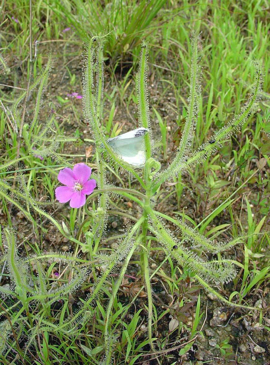 Sundews and pitcher plants are both carnivorous, and largely insectivorous, but they’re very different otherwise. Pitcher plants have a large, cup-shaped flower with a slippery rim that unsuspecting prey falls into, where it is digested. Sundews, on the other hand, have tentacles, looking like very small spines topped with a clear drop of dew, hence the name. It isn’t dew, of course; it’s a sort of sticky mucous that traps insects, where they die of exhaustion, dehydration, starvation, or suffocation, to be digested by the enzymes within the mucous.