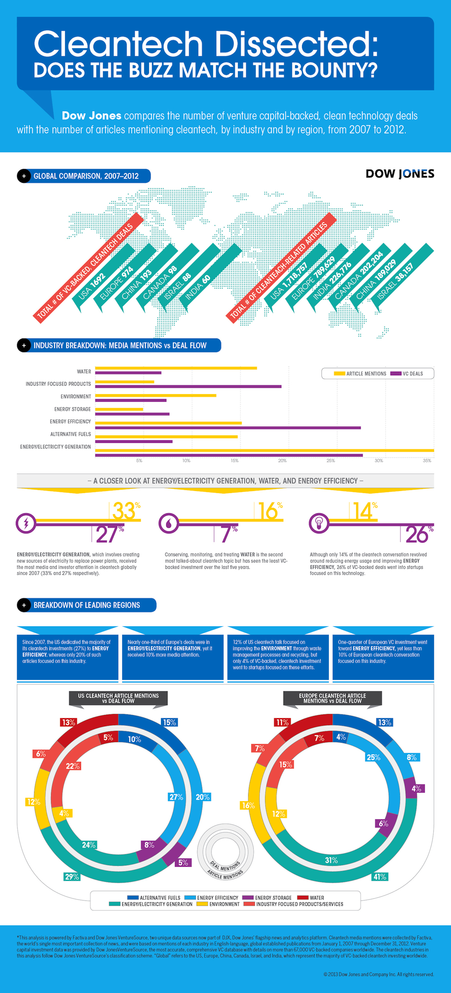 Dow Jones, examining data from 2007 to 2012, created this infographic on how media coverage of clean energy deals and actual clean energy deals intersect.