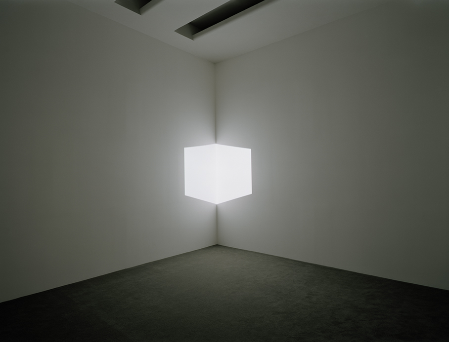 One of Turrell’s favorite visual tricks is the result of something called a dichotomous perceptual decision.The phenomenon is perhaps best explained through one of Turrell’s early pieces, Afrum I (White), on display at the Guggenheim now. A very bright, even light in the corner of an otherwise completely dark room gives the appearance of a floating, three dimensional cube popping out of the wall. Your vision intermittently shifts between perceiving the light as a solid cube and a flat beam of light, because your brain could technically see the image either way.