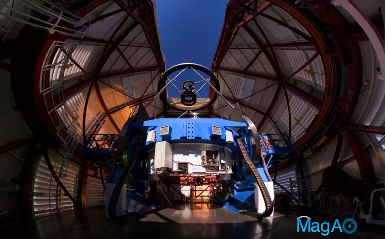 The MagAO system adds two features to the telescope that enable it see the stars so clearly. The first is a secondary mirror, 1/16th of an inch thick and and 2.8 feet across, that floats on a magnetic field 30 feet above the primary mirror. To counter distortion from Earth atmosphere, this floating mirror can change its shape at 585 points on its surface, 1,000 times a second.