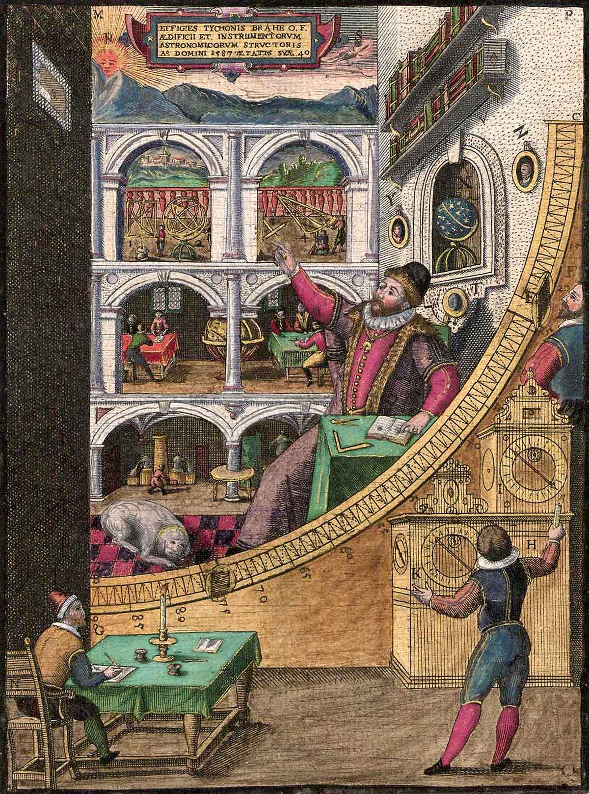 We find illuminated codices depicting well-seated astronomers, such as the likeness of Ptolemy that decorates the title page of “Ptolemaeus: Magna Compositio, Zierrahmen mit Tugenden und dem Wappen” (1465). Ptolemy is shown crowned and seated like a king upon a throne while holding a compass. But among the most famous depictions is certainly the 1598 engraving of Tycho Brahe that renders the famous astronomer installed in the middle of his renowned observatory on the island of Hven.