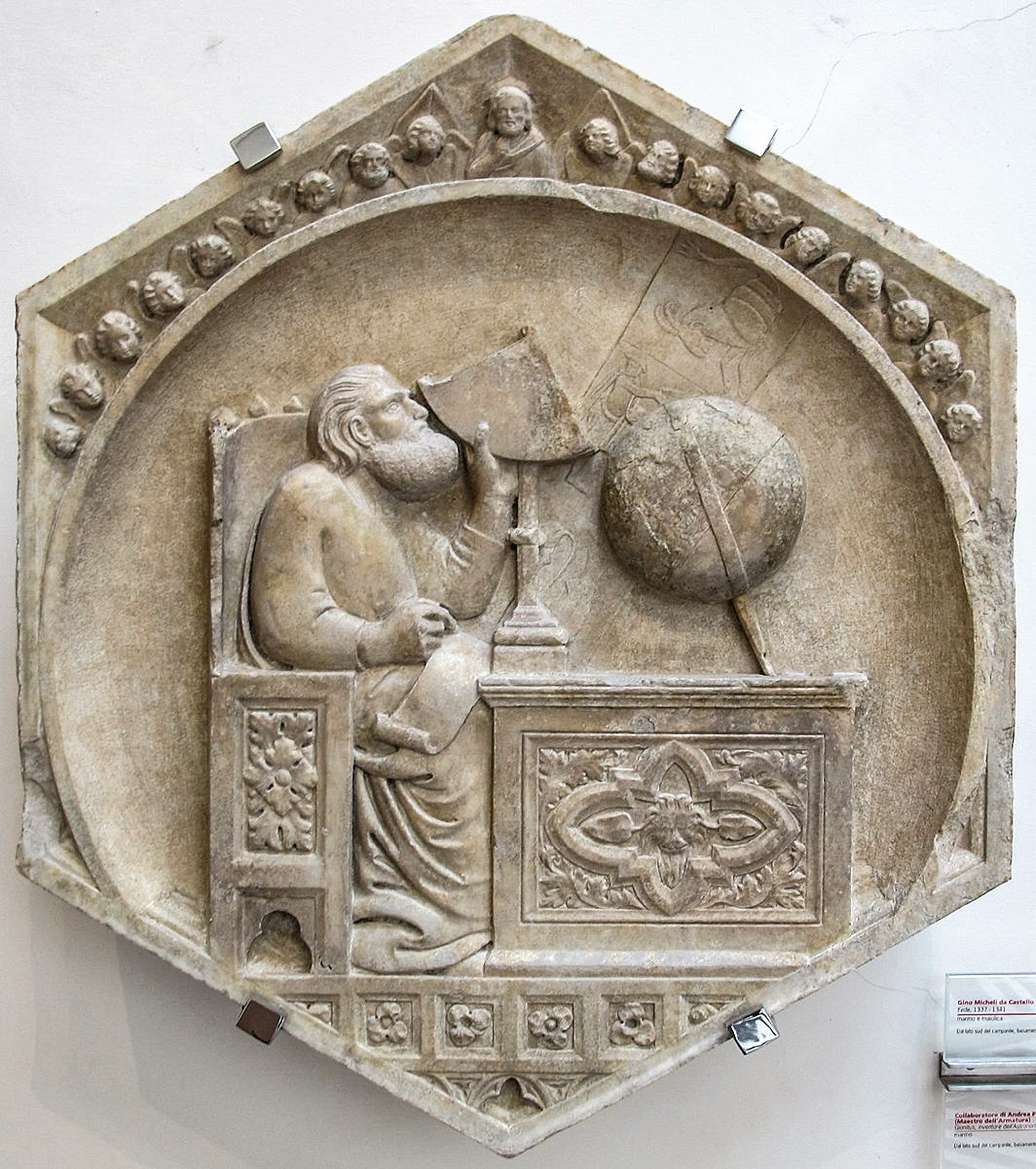 At least as far back as the mid-14th century we find a hexagonal panel relief originally crafted in the workshops of Andrea Pisano for Giotto’s Campanile in Florence. It is a panel—now in the Museo dell‘Opera del Duomo—that shows Gionitus, the mythical founder of astronomy, seated at a desk operating a quadrant while taking notes. There is also the 1493 engraved portrayal of the ninth-century Baghdad astronomer al-Farghānī (800/805–870 CE) seated on a bench next to a diminutive figure of a hermit in a Latin translation of his important work. Albrecht Dürer’s frontispiece to “De scientia motus orbis” (1504), a Latin translation of the eighth-century Arabic astronomical text by the Persian-Jewish astronomer Māshā’allāh ibn Athari (740–815 CE), shows the latter in a peculiar but presumably specialized chair holding a globe and compass.