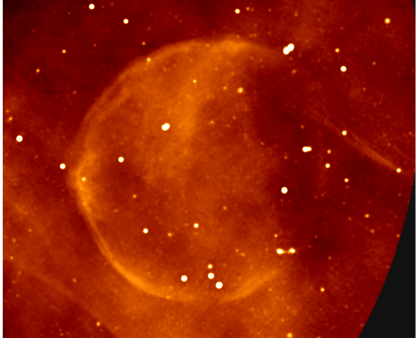 The researchers also photographed a never-before-seen supernova remnant, several light-years in diameter. Usually, the contour of a supernova remnant is distorted as it expands into space, so Camilo says this one is rare for its almost-perfect spherical shape. The bright white dots speckled about could be supermassive black holes in galaxies far away, according to SARAO.