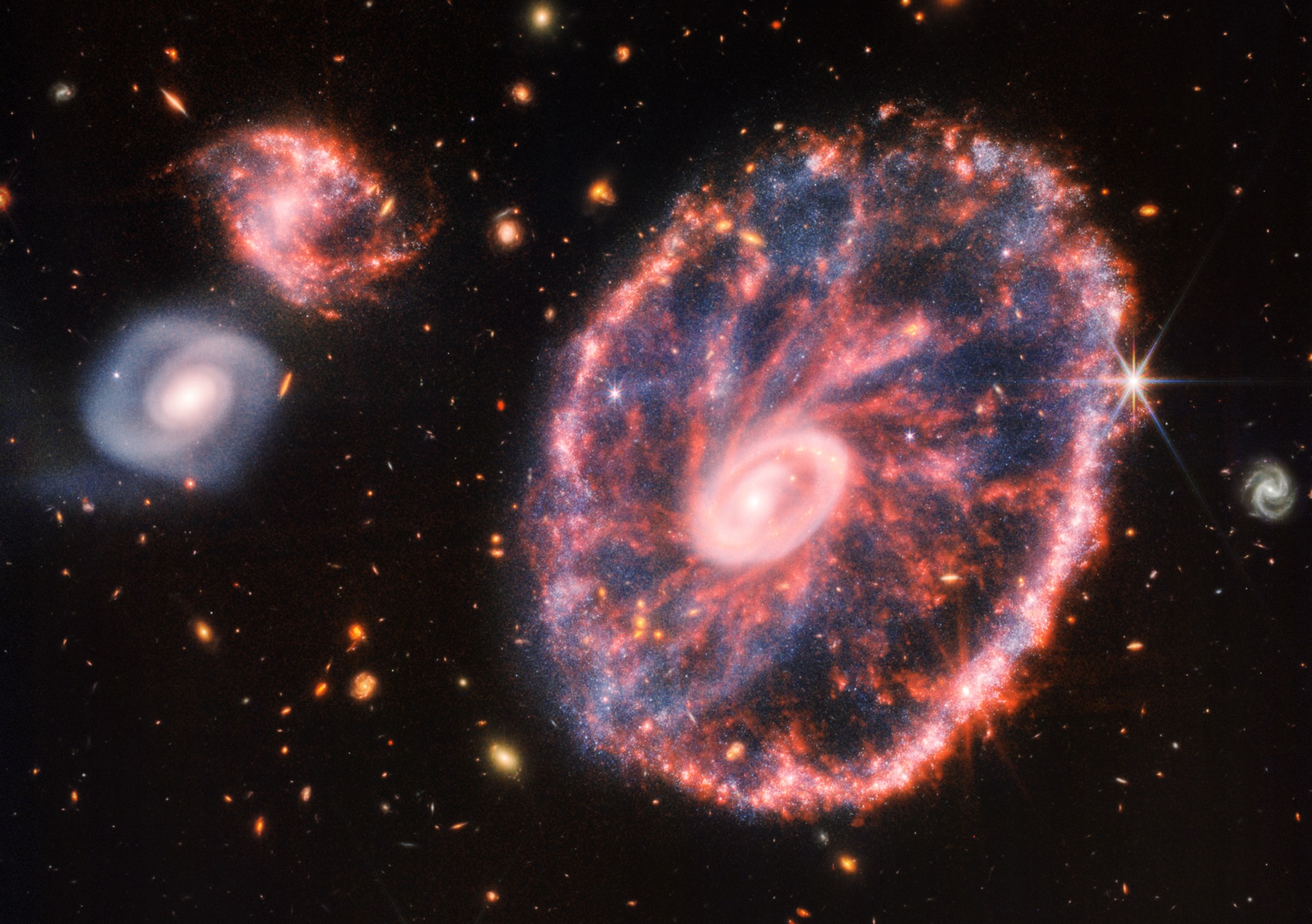 With data from the telescope’s Near-Infrared and Mid-Infrared cameras, the JWST team created a colorized composite that exposes fresh regions of upheaval in the formation. As NASA explains on its website, the blue wisps mark pockets of star production, while eye-catching red spokes map loose chemical components like hydrocarbons. The JWST image also identifies a contrast in textures between the core and the extremities of the Cartwheel Galaxy. Viewers can look at “the smooth distribution or shape of the older star populations and dense dust in the core compared to the clumpy shapes associated with the younger star populations outside of it,” according to the NASA post.