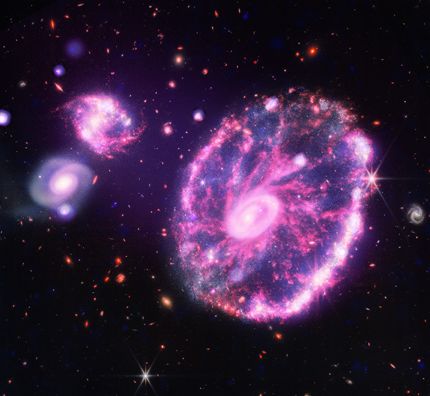 The acrobatic Cartwheel galaxy is shaped this way due to a a collision with another smaller galaxy roughly 100 million years ago. Star formation on its outer ring and other places in the galaxy was triggered when the smaller galaxy punched the Cartwheel. Chandra X-rays, shown in blue and purple, are due to, “superheated gas, individual exploded stars, and neutron stars and black holes pulling material from companion stars,” said NASA in a statement. JWST offers an infrared view in red, orange, yellow, green, and blue shows the Cartwheel galaxy and two smaller companion galaxies that were not involved in the 100 million year old collision.
