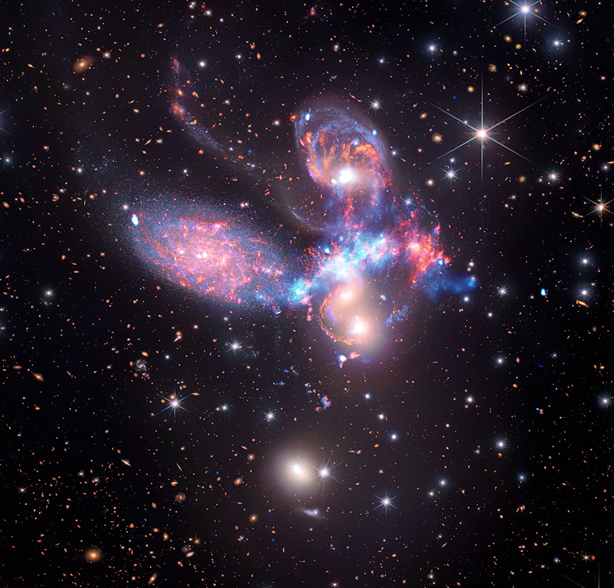 Four galaxies within Stephan’s Quintet (about 620,000 lightyears across) are doing an intricate dance with gravity. The fifth galaxy is merely an observer, watching from a distance. The images of the quintet taken by JWST (which have red, orange, yellow, green, and blue colors) shows never-seen-before features and details of the, “results of these interactions, including sweeping tails of gas and bursts of star formation,” according to NASA. The Chandra data (in light blue) of this same system shows a shock wave heating up gas to tens of millions of degrees, while one of the galaxies passes through at about 2 million miles per hour. Infrared data from NASA’s now-retired Spitzer Space Telescope (shown in red, green, and blue) as also included.