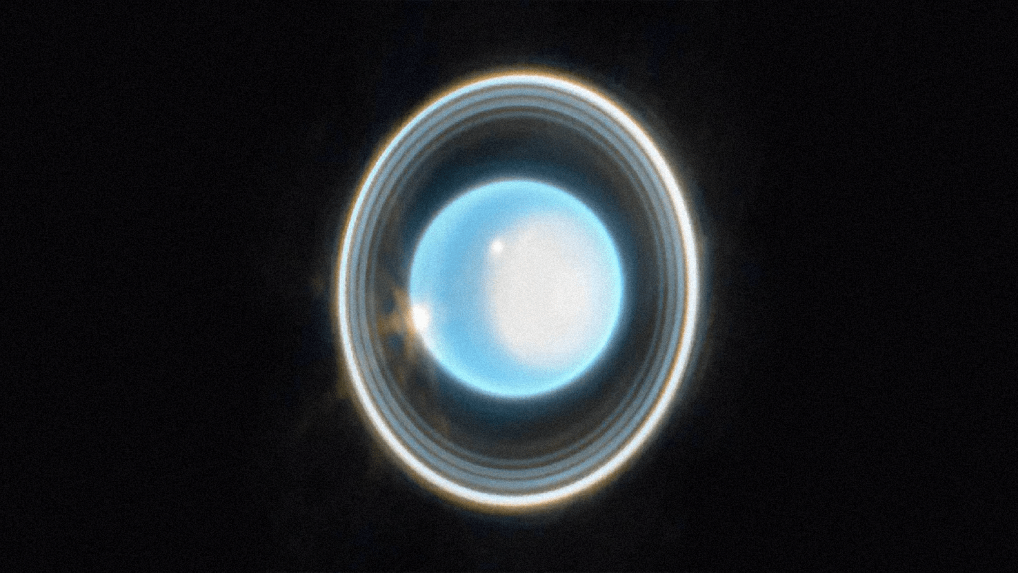 The image was taken with NIRCam as a short 12-minute exposure and combines data from two filters, one shown in blue and one in orange. Uranus typically displays a blue hue naturally.