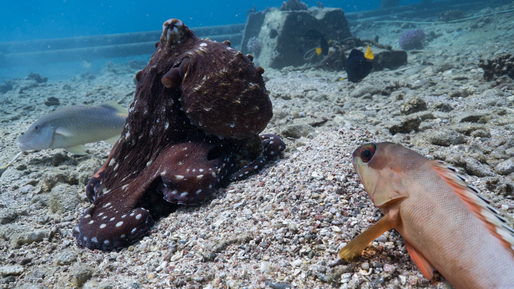 Over the course of 120 hours spent diving and recording video on a specially designed wide-angle camera rig in the Red Sea, researchers captured 13 separate instances of mixed-species hunting. It took “a lot of effort” to collect those observations, says Eduardo Sampaio, lead study author and an animal behaviorist at the Max Planck Institute. Sampaio managed the camera rig with his colleagues in multiple daily dives, searching for camouflaged octopuses on the ocean floor, hoping in each instance to time things just right and stumble upon the sea creatures at mealtime.