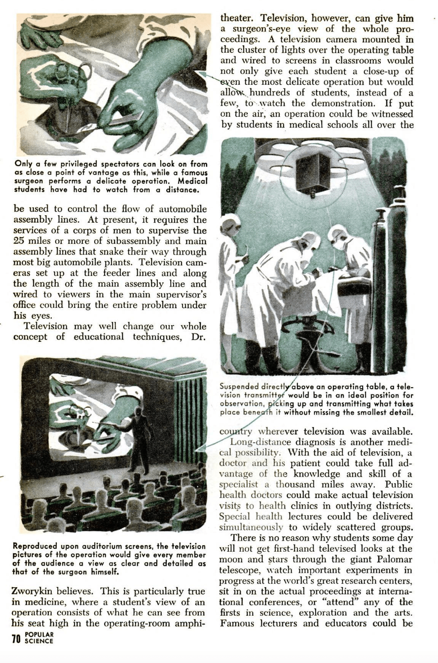 By 1947, operating theater had become operating TV. What had once been performed for a live audience was now performed for a much larger TV-viewing audience. From there it was a straight line through Hollywood to today’s popular medical series. Filming surgeries offers more than just dramatic entertainment, though; medical students benefit from watching surgeons in action.