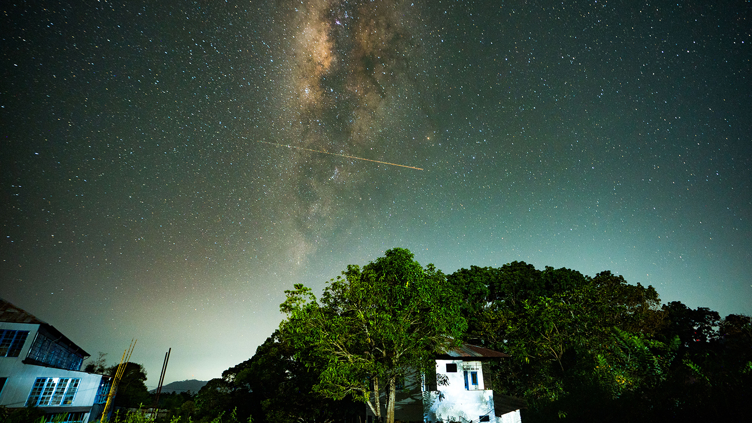 A flight-illuminated path and milky way were seen in the sky on August 14, 2023, in Ratnapura, Sri Lanka. Thilina Kaluthotage/NurPhoto via Getty Images
