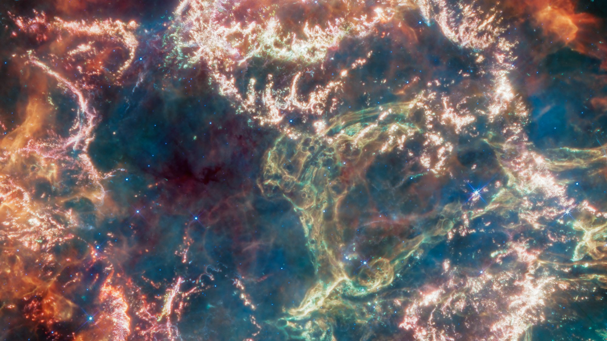 The end result, of course, also depends on what kind of data the image specialists have to work with in the first place. The team often chooses different colors to highlight the fact that NIRCam and MIRI—two of Webb’s infrared cameras—are looking at different wavelengths (near-infrared and mid-infrared, respectively), and therefore different physical structures. For example, in the Cassiopeia A supernova remnant, JWST’s observations revealed a bubble of something emitting a specific wavelength of light, colored as green in the MIRI image and resultantly known as the “Green Monster.” Without this visualization, astronomers may not have noticed such a curious feature that provides insight into how giant stars die—and after some investigation, they figured out the Green Monster is a region of debris disturbed by the huge blast from the supernova explosion.