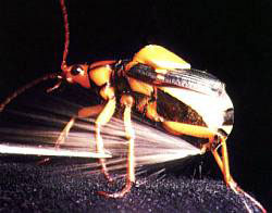 According to an article in April’s issue of Physics World, the beetle’s abdomen essentially harbors a small chemical lab and combustion chamber. The gases react inside the confined chamber, eventually cranking up the heat and pressure to a point at which a valve is forced upon, and the toxic jet spurts out.
