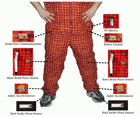 Several small circuit boards containing microcontrollers, sensors, and communication devices — called e-TAGS — are embedded in the pants at the hip, knee, and ankle joints. Each foot has a piezoelectric sensor—a sensor that generates an electric pulse through applied stress—at the heel that is connected to an e-TAG in the pants. The whole setup is powered by a nine-volt battery attached near the waist.