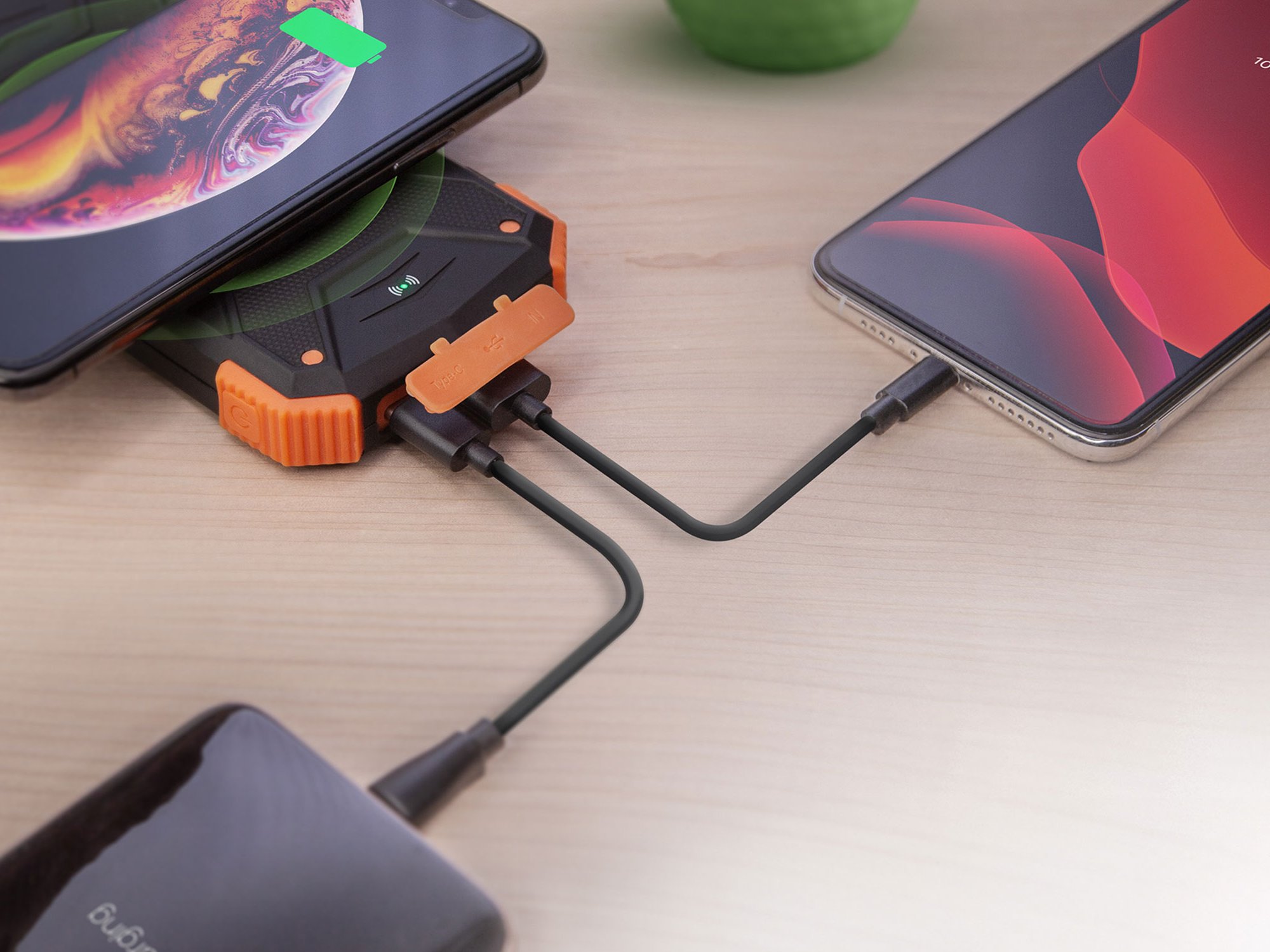 Charge two more devices at the same time with USB-A and USB-C outputs. The 10,000mAh power bank packs enough capacity to charge your phone several times. And remember: you only need the sun to recharge, but you can use a cord for a faster power boost.