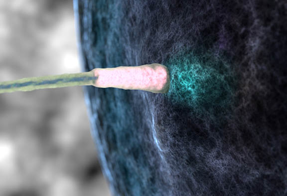 Instead of x-wing Starfighters opening fire on the Death Star, Ingber and Reilly picked sperm targeting a different sort of thermal exhaust port—racing to fertilize an egg. Critical to their film was accurately depicting the sperm’s tail, called an axoneme, a tube made up of nine pairs of microtubules arranged in a column around a long central pair. Animating it properly meant maintaining an accurate biological model all the way down to the atomic level.