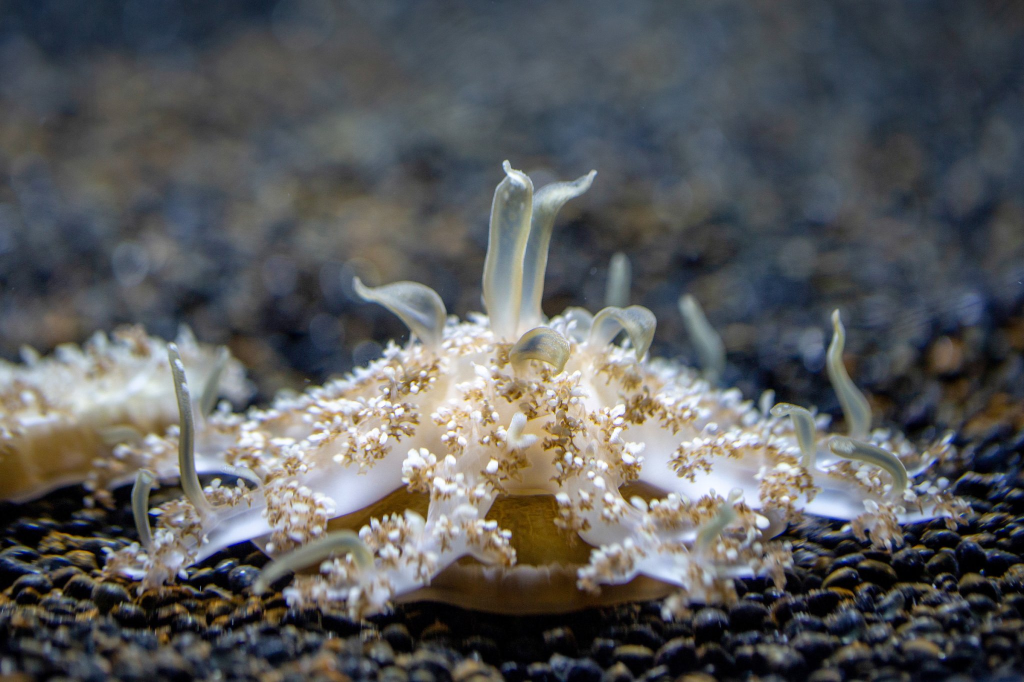 This group of jellies, known as upside-down jellyfish, is a bit unusual. They don’t drift through the water, capturing prey in their long, trailing tentacles like their cousins. Instead, they lie on the ground and, with the help of stubby arms, they wave about all day in mangrove forests, seagrass beds, and other coastal habitats. Upside-down jellies get some of their nutrients from the symbiotic photosynthetic algae living inside their cells. However, they also feast on brine shrimp, nematodes, and other hapless creatures snared by the clouds of mucus they pump into the surrounding water. “It’s like dropping a ball of saliva while it’s still stuck to your lip and then being able to suck it back in,” Ames says.