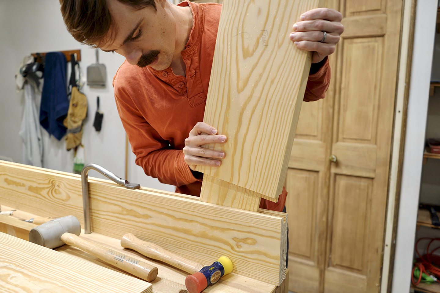 6. Assemble the door. Before assembly, be sure to dry-fit the pieces of your door to make sure everything lines up. It’s helpful to use clamps at this stage even though it’s a test fit, just to ensure your clamps are long enough. Once you’re confident everything fits, glue the mortise and tenon joints together in the center portion of the door first—the pieces that form a lowercase “t.” Then insert the panels into their grooves, being sure to avoid getting any glue on the panels. Remember, each one needs to float freely within its groove. Then, glue on the outer stiles to complete the door.