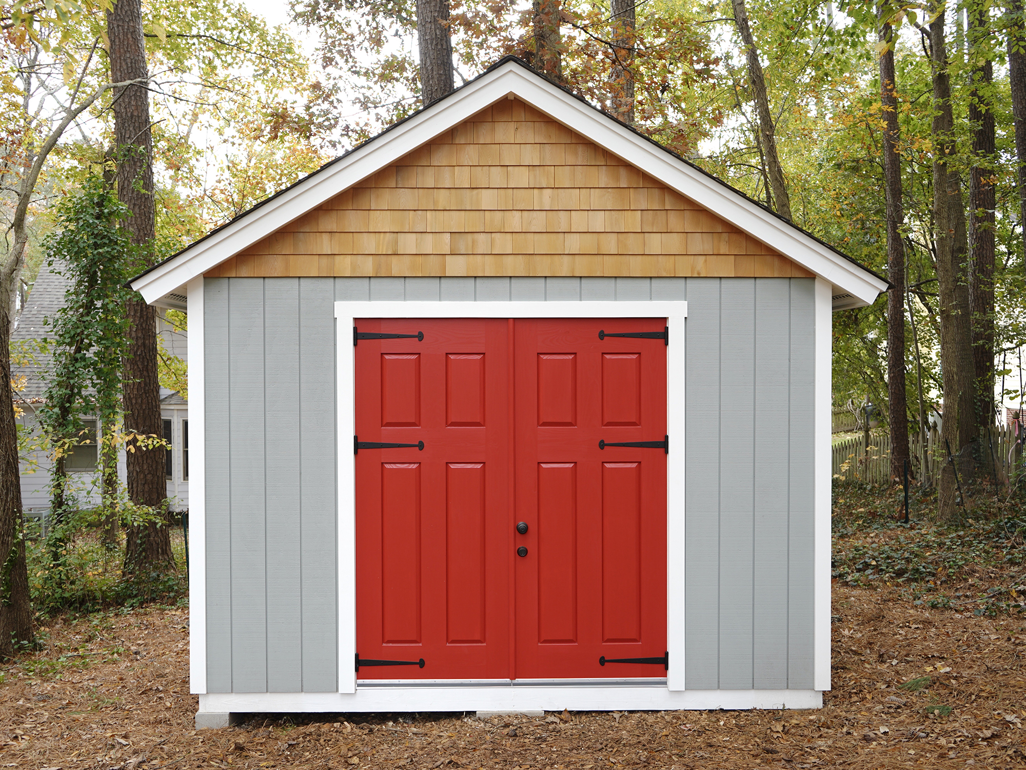 8. Install the door. I choose a beautiful set of strap hinges for my doors, to give my shed a distinctive look. Be sure to check that you’re buying hinges that support the particular weight of your door. My doors weighed around 100 pounds each, so I found hinges that could support a bit more than that just to be safe. I started by attaching the hinges to my door. Then I moved them into place, using shims to get the door centered in the door jamb. Once I got things set, I marked where the hinges met the jamb. I then removed the pads from the hinge and fastened them in place using the supplied screws. Lastly, I put the door back in place and drove the pins through the hinges.