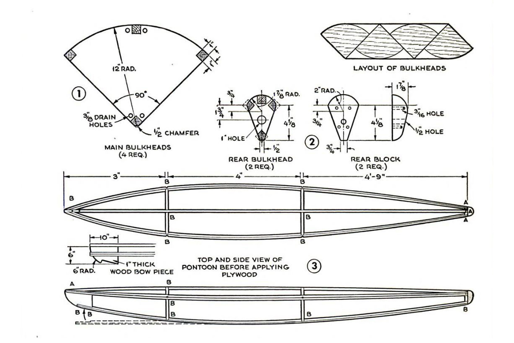 Lay out the four main bulkheads on the 1-inch board as indicated above Fig. 2. At this point, drill the ⅜-inch holes in the bulkheads as in Fig. 1. These holes are for drainage if the pontoons should leak. By resting the boat across a dock and raising the front, the water will drain through the 1-inch hole in the rear bulkhead and the ½-inch hole in the rear block. Taper the latter hole with a round file and use a cork as a plug. A screw in the cork will make it easier to remove.