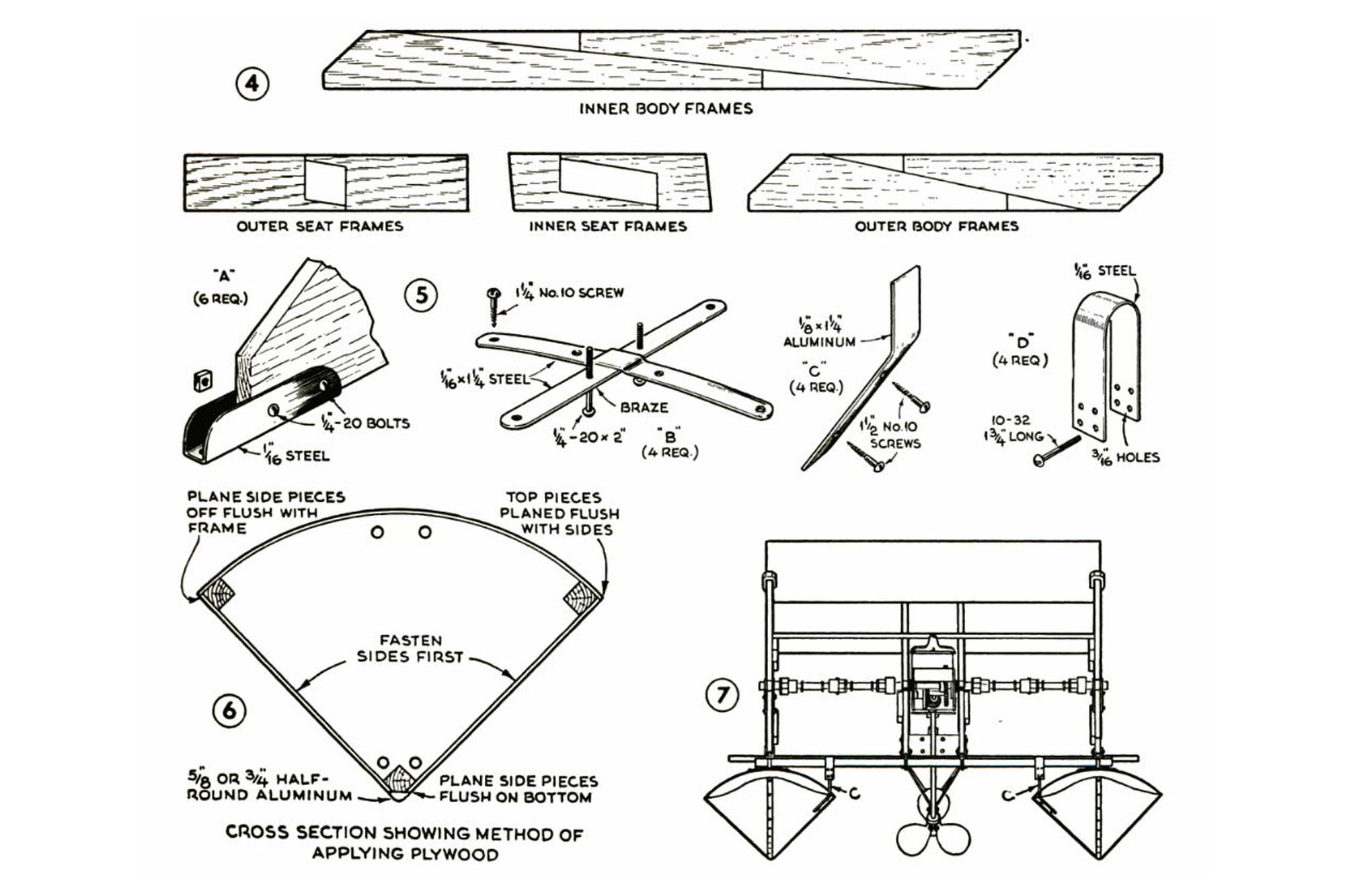 The pontoons—the most important part of the craft—may be covered with 0.020-inch or 0.032-inch aluminum or with plywood. I used ⅛-inch water-proof plywood on the one I built. Three 4-by-8-foot sheets are enough.