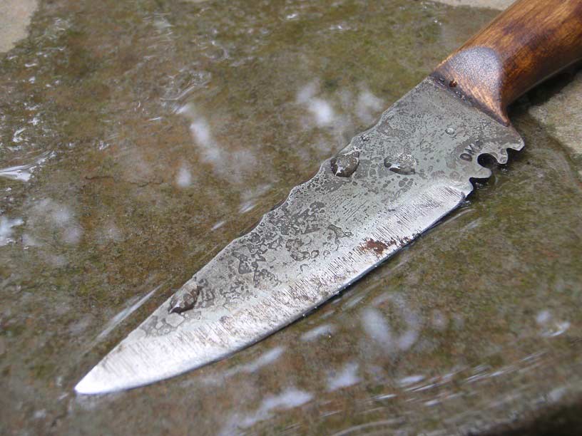 Start by taking out your sharpening kit or selecting a smooth fine-grained stone. If you decide to use a natural rock, try to find one with a slightly rough surface similar to a normal sharpening stone texture. It’s also helpful to study the knife edge and look for damage before you start sharpening. Edge areas with chips and rolls will need more aggressive grinding; ordinary dullness may only require a little grinding on a finer grit stone. It’s helpful to get a baseline for sharpness before you start sharpening, so try slicing through a piece of paper or rope to test the edge. Once you’re ready to sharpen, pour some water to the stone (to keep the pores open) and begin your sharpening strokes. I prefer to make little circular strokes, using an equal number of strokes for each side of the knife, but some prefer to move the blade in other directions. Do what’s comfortable for you. Wash off the stone periodically as you work and try your best to hold the edge at the correct angle. You’re usually trying to restore the factory edge angle, not create a new one. You can test your knife during the sharpening process by slicing the paper or rope again, just to see where you are at, or wait until the end. Once you feel you’ve sharpened enough, strop the edges on a leather belt or bark-less log to remove the edge bur and polish the edge. Then test your knife on paper and see if it’s good enough. Apply a little oil when the sharping is done and your knife will be ready to use the next time you need it.