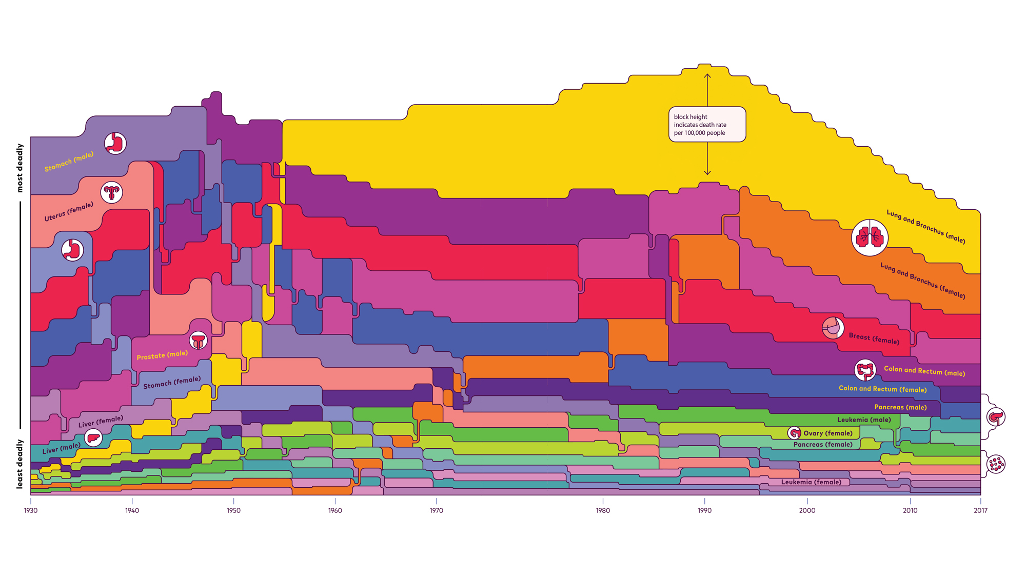 For much of the 20th century, cancer was an unspeakable diagnosis. Doctors often wouldn’t tell patients about their illness because they generally couldn’t treat it, and they considered it unethical to take away a person’s hope. The equation began to shift when Richard Nixon signed the National Cancer Act in 1971, authorizing hundreds of millions of dollars in research funding. Today, while the overall number of cases is increasing (we live longer and are less likely to die from other diseases), biologists and oncologists have made some incredible strides. New screening techniques, genomic sequencing, and tactics like immunotherapy and stem cell treatments have saved lives. There’s still work ahead—Black men in particular are more likely to die from many major cancers than their white counterparts—but zooming in on a selection of these malignancies shows how far we’ve come.