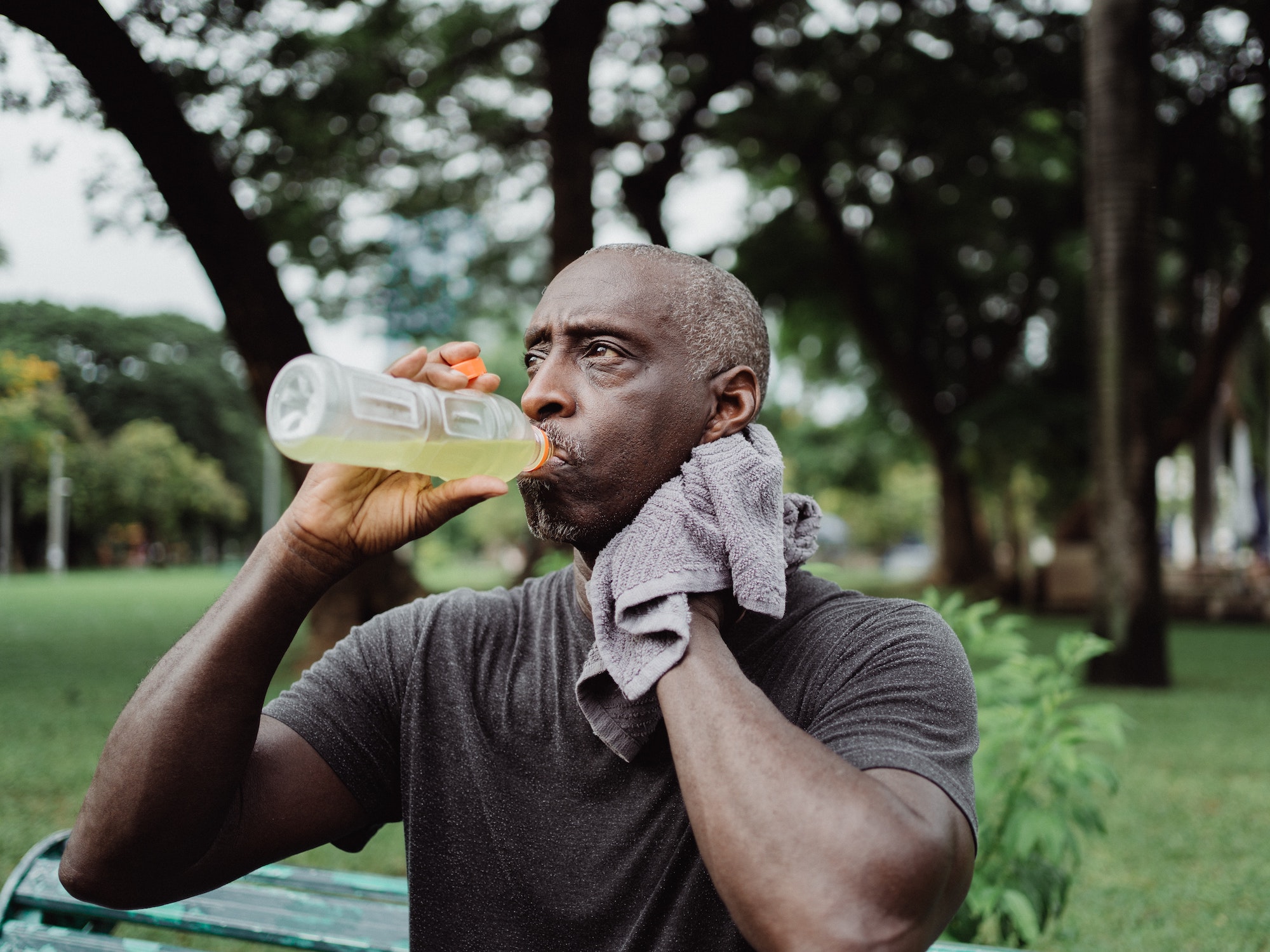Fortunately, Adair has a good rule of thumb to go by: If you’re exercising for more than an hour, and your t-shirt or hat dries with a white residue, that’s a pretty good indicator that you’re losing a lot of sodium and might benefit from a sports drink (along with getting sodium in your diet).