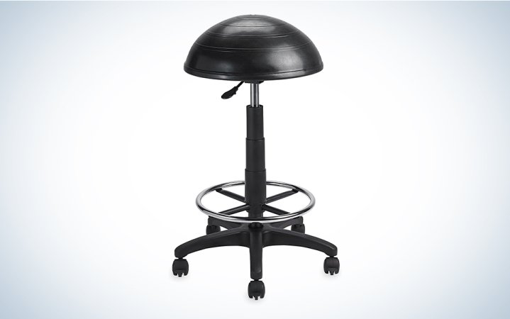 See ItGaiam is at it again, this time with a great yoga ball stool. The half-dome inflatable cushion causes micro-movements to strengthen the core and improve posture (at the right height). It can extend up to 33 inches with a 360-degree swivel base and five lockable caster wheels. This seat also includes a metal footrest, which is necessary for good posture if your feet don’t touch the floor.